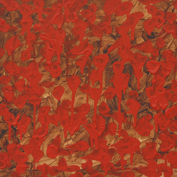 Aqua Gold, and its blue and orange/yellow colour combination is interesting for its contrasts and similarities to Electricity. One of the main differences is that the background here is loosely painted to allow a variation of colour leading to a great sense of depth and movement. The orange/yellow marks on top are, like in Electricity, loosely painted but carefully placed. However in contrast to Electricity they are less densely placed. This allows for longer, languid brush strokes that the eyes can follow. There is also varnish applied to this painting to instil a sparkling sense of glitter.