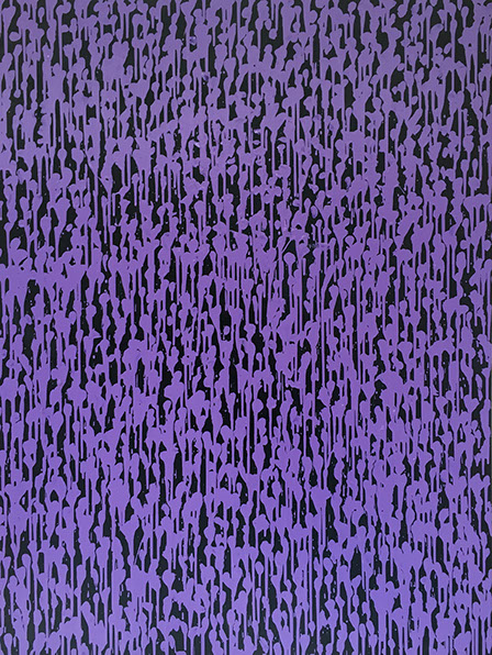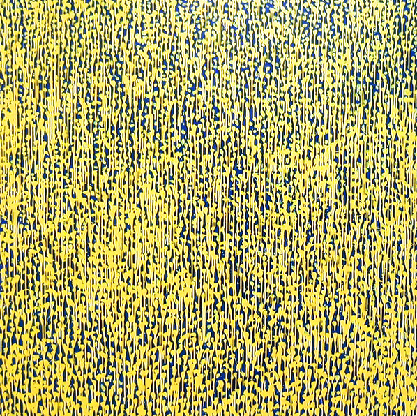 For me these paintings are dealing with colour and space. I’m endeavouring to push simple colour combinations to their absolute limit. For example with the painting Aqua Gold the complementary colours blue and orange, and with the painting Electricity, violet and yellow. I wanted to make the colours resonate in our eyes as much as possible. To a degree I was working within the same sphere of investigation as the pointillists, like Paul Signac.
